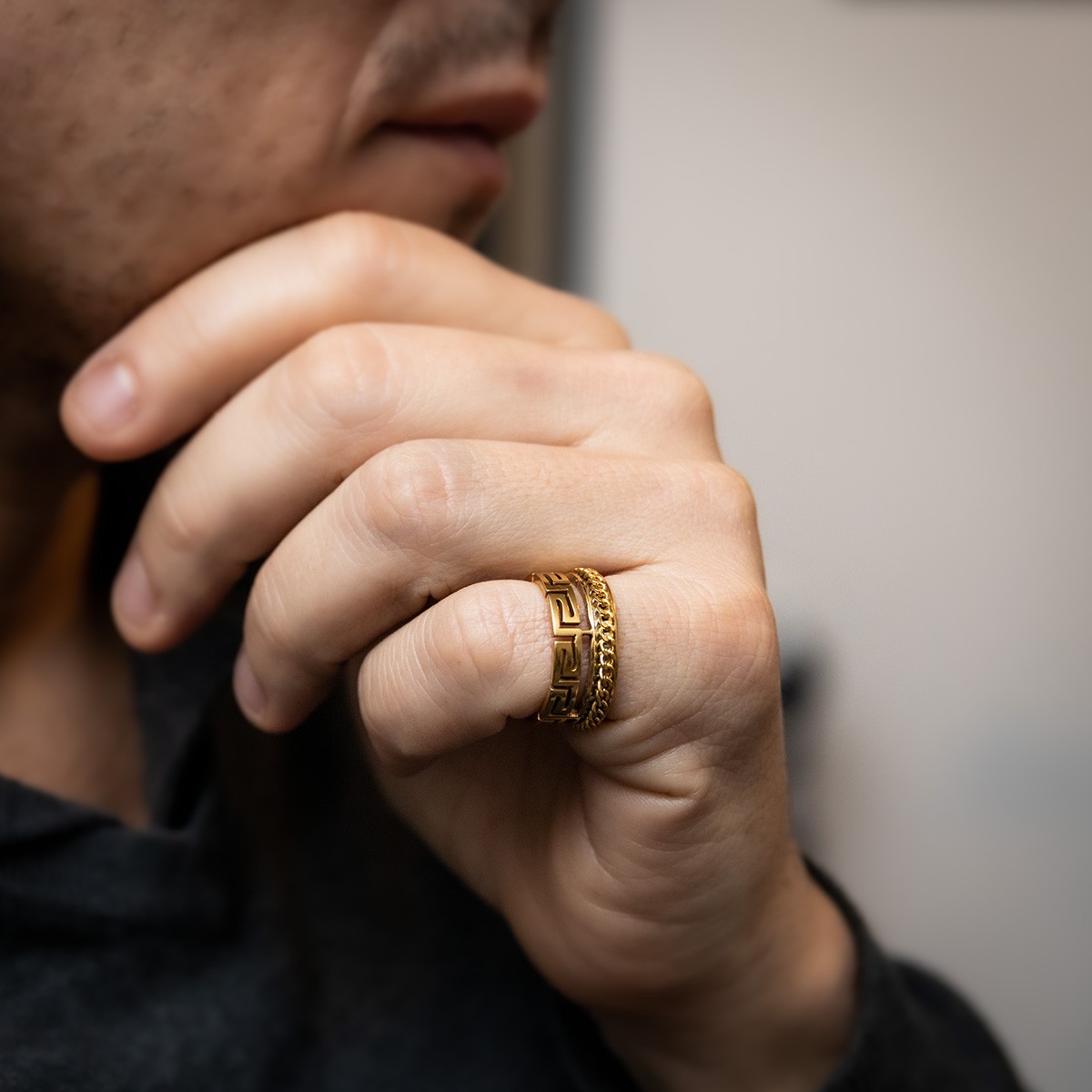 – La bague anneau pour homme CALIMA, livrée avec sa pochette cadeau, est une jolie bague ornée d’une chaînette et d’un symbole tribal. Cette bague homme propose un style original et nouveau. Sa couleur dorée est flamboyante. C’est une bague homme à un prix incroyable pour ce type de finition