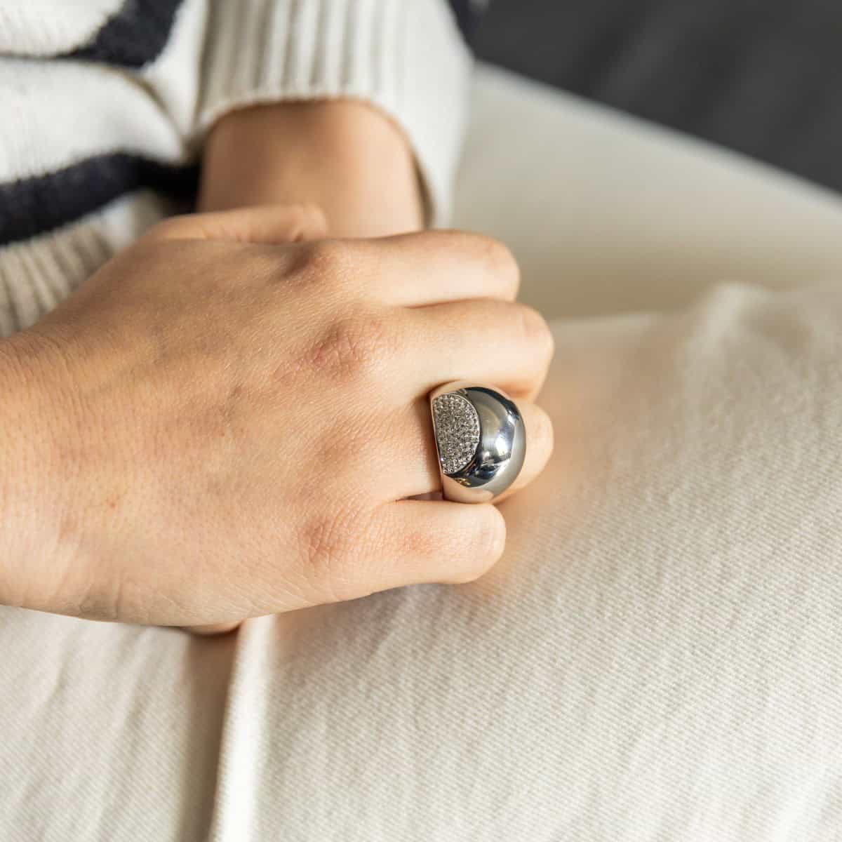 Bague femme ornée oxyde de zirconium – La taille indiquée est le périmètre (le tour) de votre doigt en millimètre (mm) – Marque Française – Made in RPC – Matière : Acier – Largeur : 20mm – Livrée avec pochette cadeau