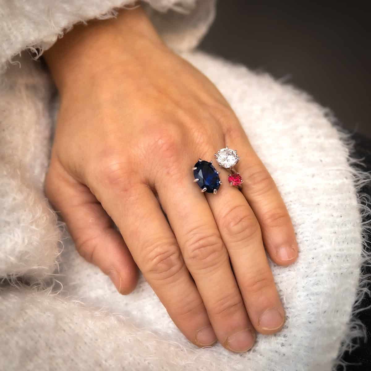 – Cette splendide bague femme est ornée de trois beaux oxydes de zirconium bleu, rose et blanc- Cette bague pour femme est sensationnelle. Tout en rhodium, avec ses strass en Oxydes de Zirconium rose, bleu et blanc et d’autres plus petits qui réhaussent son élégance naturelle, cette bague vous fera briller de mille feux