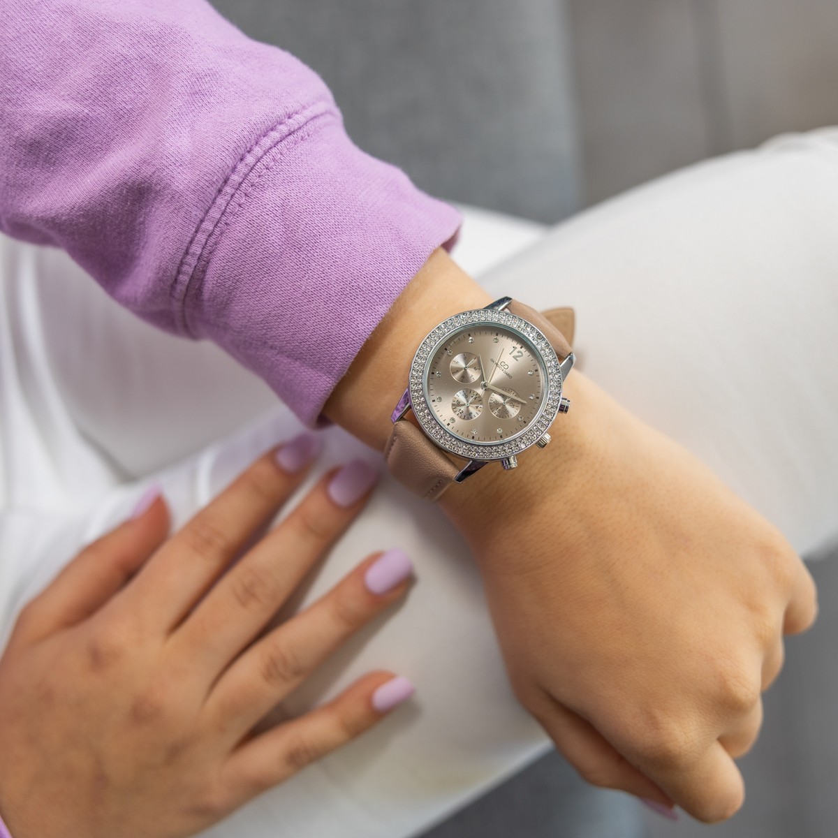 – Cette montre femme livrée avec coffret est magnifique. Son cadran est incrusté d’une centaines de strass. Cela apporte à cette montre un coté très féminin et chic. Son cadran est équipé de trois cadrans factices pour un très bel effet chrono. Le confort d’utilisation n’a pas été mis de coté ! Les aiguilles métallisées de cette montre se détachent visuellemement du fond du cadran pour une lecture de l’heure très facile. Les indexes principaux sont représentés par 11 strass. Son bracelet surpiqué d’une très belle couture est très agréable à porter.