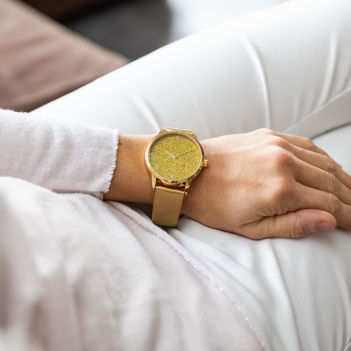 – Cette montre pour femme livrée en coffret au format XL est très incroyable avec son style éclatant. Son cadran brille grâce à ses centaines de paillettes. Son cadran est très épuré avec de belles aiguilles de la même couleur que le bracelet. Plus qu’une montre c’est un véritable bijou. Son bracelet est en maille milanaise est très facile à régler sans outils spécifique