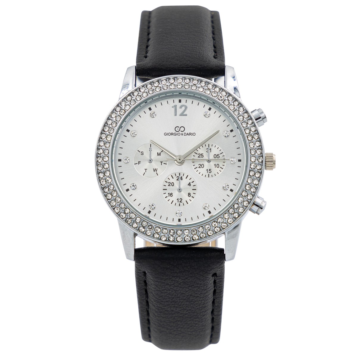 – Cette montre femme livrée avec coffret est magnifique. Son cadran est incrusté d’une centaines de strass. Cela apporte à cette montre un coté très féminin et chic. Son cadran est équipé de trois cadrans factices pour un très bel effet chrono. Le confort d’utilisation n’a pas été mis de coté ! Les aiguilles métallisées de cette montre se détachent visuellemement du fond du cadran pour une lecture de l’heure très facile. Les indexes principaux sont représentés par 11 strass. Son bracelet surpiqué d’une très belle couture est très agréable à porter.