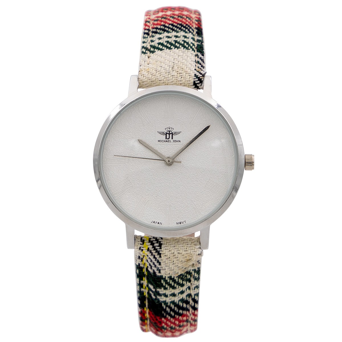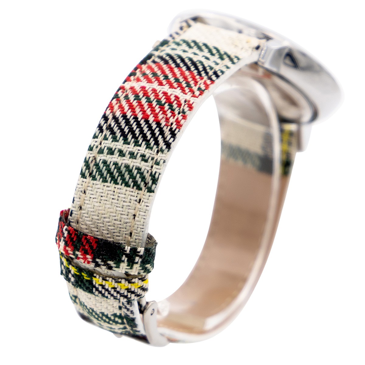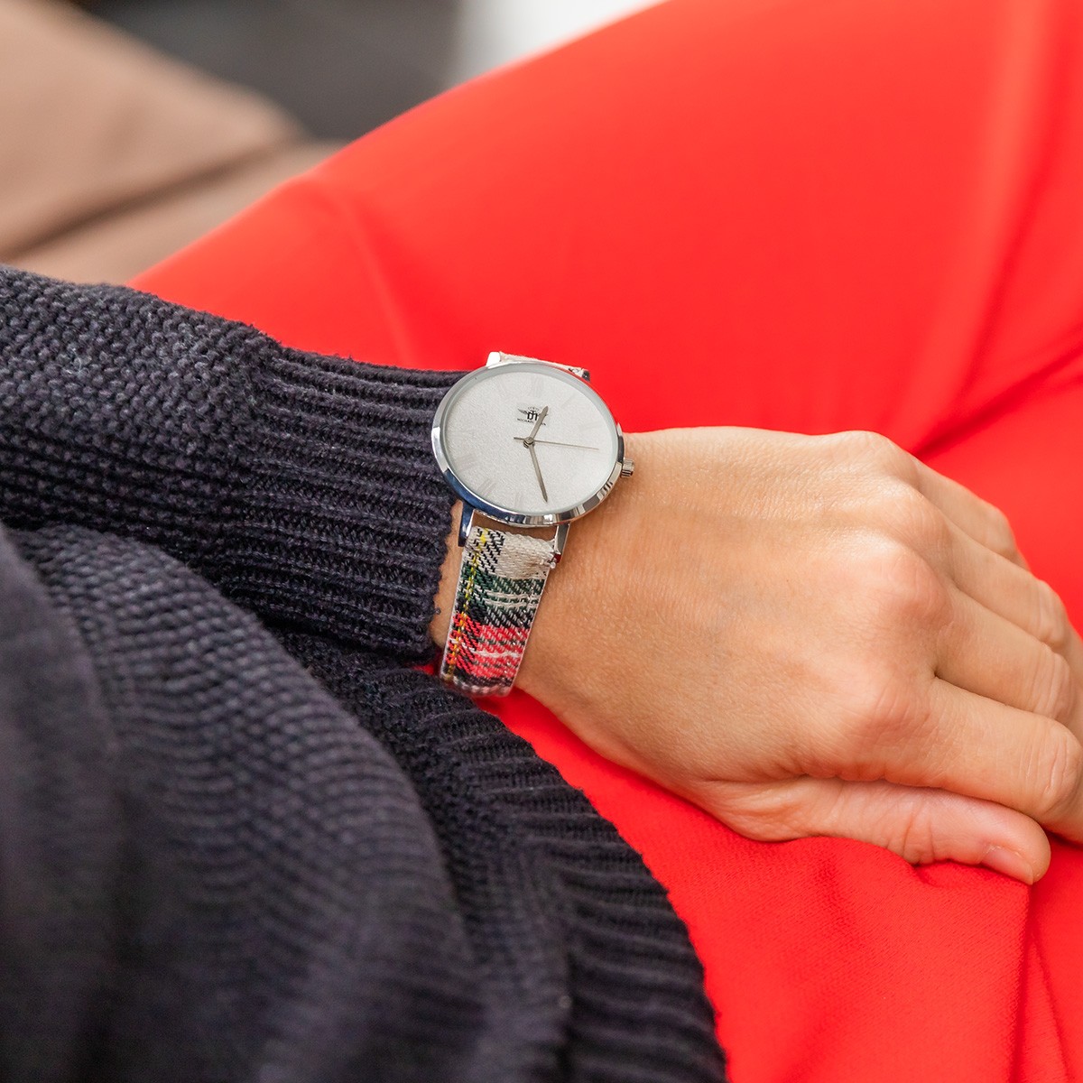 – La classe assurée ! Cette montre femme avec son design passe partout conviendra pour un usage au quotidien. Son bracelet en tissu style écossais est vraiment très original. Son cadran est orné de douze chiffres indexes métallisés avec le chiffre gravé en plus. Les autres indexes sont gravés dans le cadran et vous permettent à l’aide de très belles aiguilles une lecture de l’heure précise