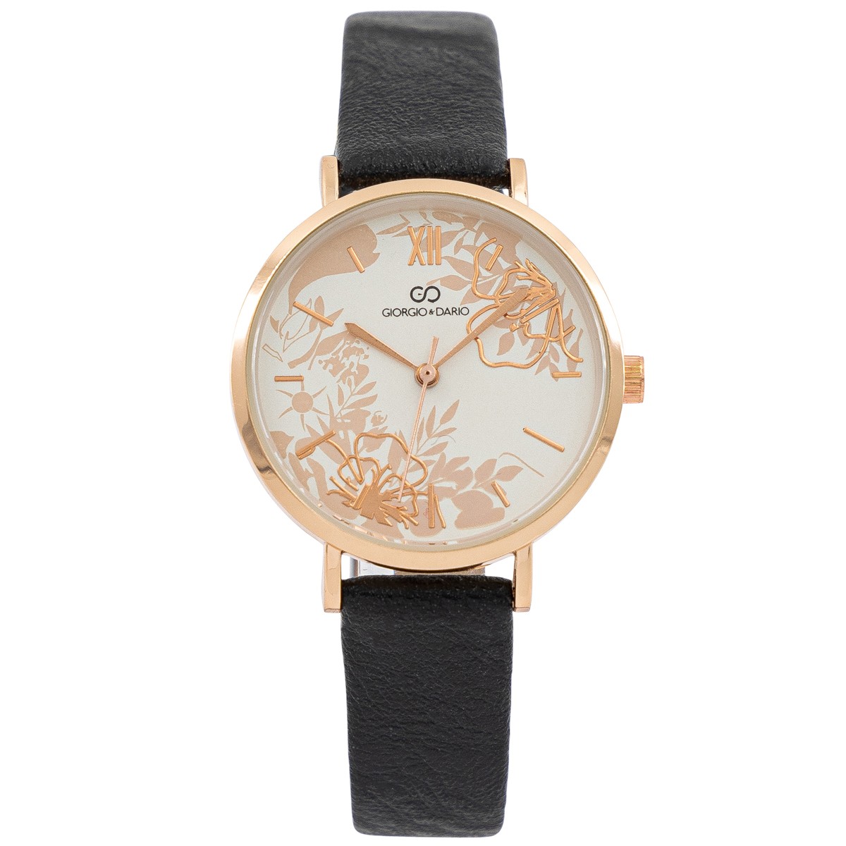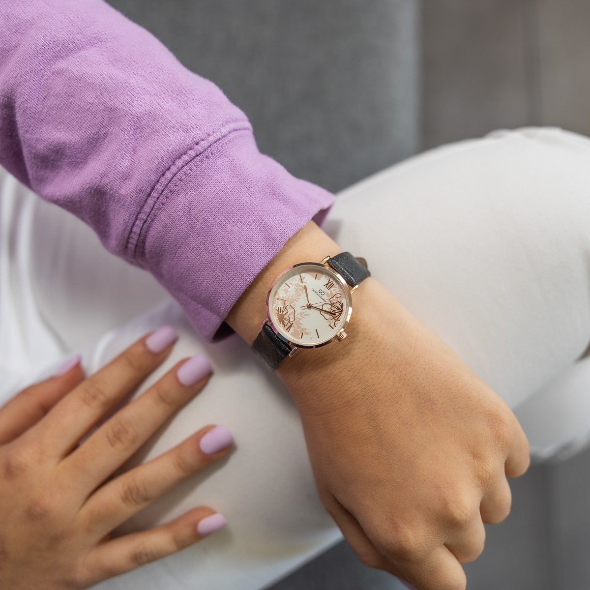 – Cette montre femme livrée avec pochette cadeau est parfaitement réalisée. Son cadran est incrusté de très belles fleurs métallisées.Cela apporte un trop joli contraste délicat. Ses aiguilles et indexes métalisés facilitent la lecture de l’heure. C’est une montre légère, très agréable à porter grace à son bracelet souple